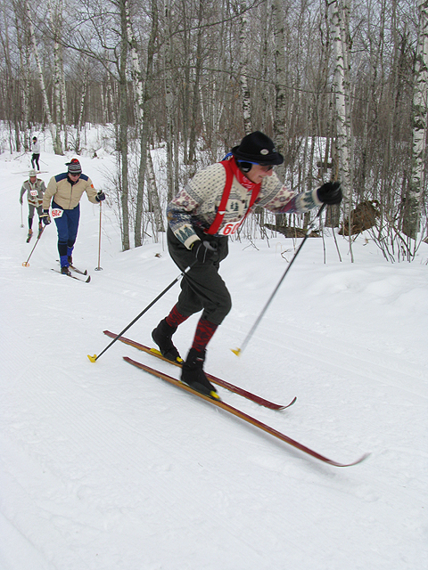 YOUNG SKIERS TAKE TOP AWARDS Skiers came from all over the region as Snowflake Nordic Center hosted the eighth annual Wood N Ski Rendezvous on March 15, 2008. Young faces of second generation wooden ski striders showed a strong presence in the field and in the standings. The 5km classic-only race/tour celebrated the history of cross country skiing, using wooden skis, bamboo ski poles and vintage clothing. NCAA skier Bjørn Bakken, from the College of St. Scholastica, had trouble with his vintage bindings. Instead of giving up, Bakken skied on one ski and ran on the other foot to finish 8th in the men’s field. Bakken, a graduate of Marshall High School in Duluth, transferred from the University of Maine, Presque Isle this year after being named to the Biathlon World Championship Junior Men’s Team. Another young biathlete, Kurt Farchmin skied to an eleven-second win for first place, over veteran wooden ski enthusiast and racer, Chris Hegg of Grand Marais, MN. Farchmin arrived to Snowflake Nordic Center in need of wax and boots. Marshall School Coach Dave Johnson provided Farchmin with brand new, vintage 75mm ski boots and an application of klister ski wax to facilitate his win. Farchmin skied to his win on a pair of wooden Madshus Birkebeiners. Hegg was proud to announce that he has over 7000 km on his pair of Elite wooden skis. Two Harbors High School Skier Kira Peterson came from behind and won the women’s race, finishing nineteen seconds ahead of Liz Wagner, who won the woman’s division at the Rendezvous the last two years. Wagner stated, “I felt like a mom standing between two of my daughters”, referring to a photo pose with Peterson and third-place finisher Ellen Anderson. Anderson is a college student at the College of St. Scholastica. George Hovland, owner of Snowflake Nordic and former Olympian, skied the Wood N Ski Rendezvous in the same ski knickers that he wore in 1952 in Oslo, Norway at the Winter Olympics. Hovland loves to talk about the early days of skiing. Conditions at the Wood N Ski Rendezvous were typical for March with 25° F temperatures, cloudy skies and transformed, crusty snow. Jack Burklund, volunteer groomer for Snowflake Nordic spent eight hours preparing the 5 km course for the event. A double set of classical tracks snaked through the birch and aspen forest as skiers negotiated the turns and hills of the trail system. Marshall Ski Coach Dave Johnson provided the timing support. Johnson is a long-time supporter of cross-country skiing. Greg Fangel, organizer of the event, displayed a pair of nine-foot wooden skis dating to the early 1900’s along with a single ski pole. In the early days of cross-country skiing, only one pole was used and skis were hand-made. When factories started mass-producing skis in the early 1900’s, the standard length became 6-8 ft. Skis were made from hickory, pine maple, ash and birch. Awards were given to the top three men and women overall. A small committee gave an award to the best dressed male and female skier. Best dressed refers to the skier who has the most authentic dress for the early days of cross-country skiing. Most clothing reflected ski dress in the 1960-70’s. Wynn Roberts won the best dressed male award and Ellen Anderson won the best dressed woman’s award. Skiers at the Rendezvous were already talking about next year. Stay tuned for information about the event in 2009. Click on thumbnails for larger photos